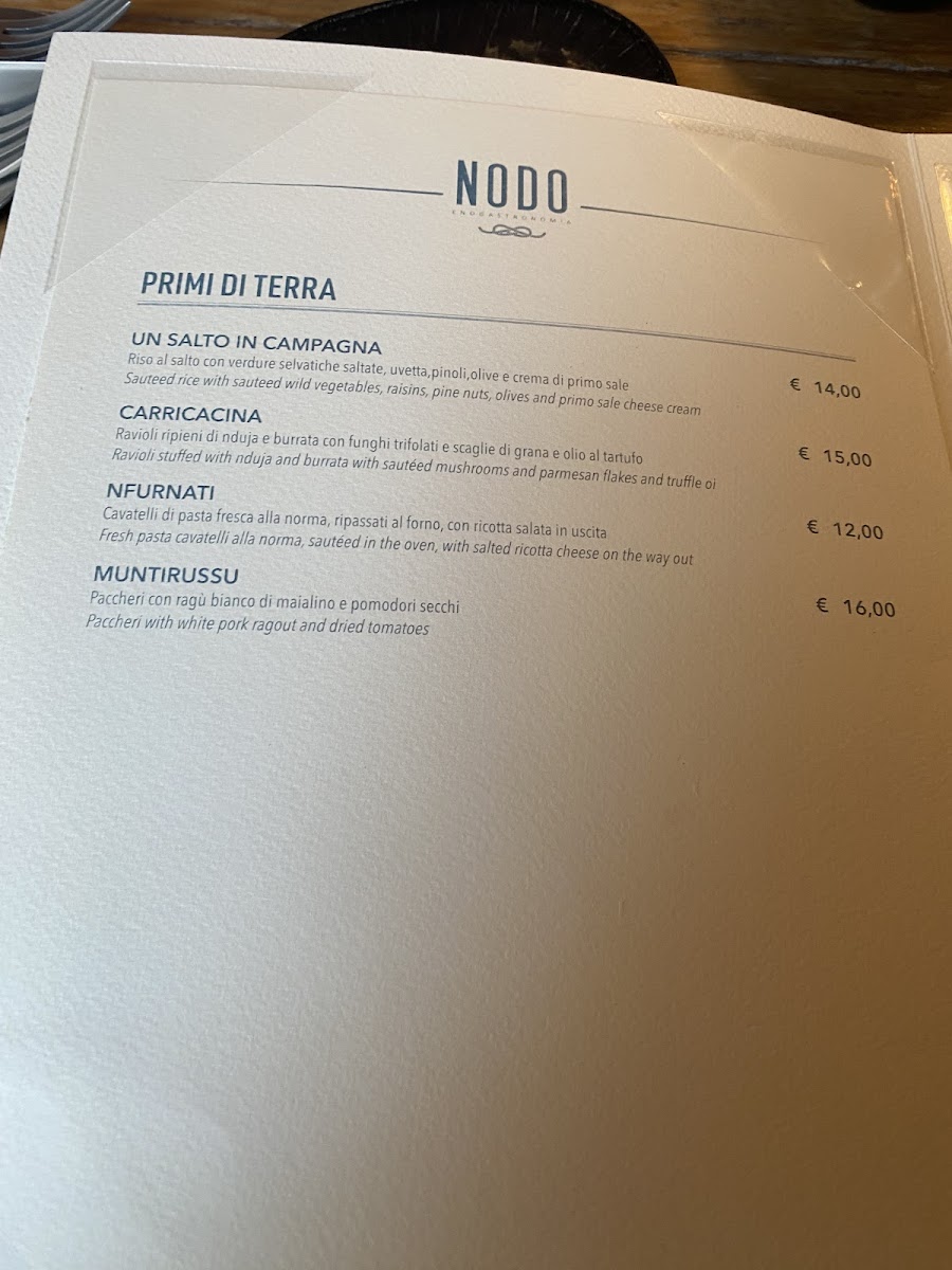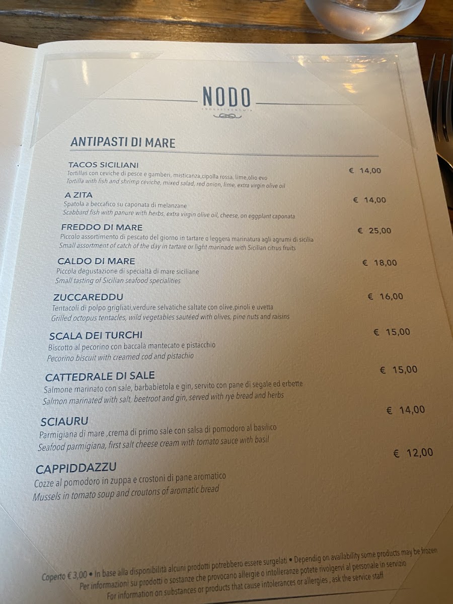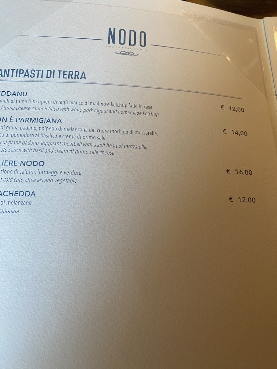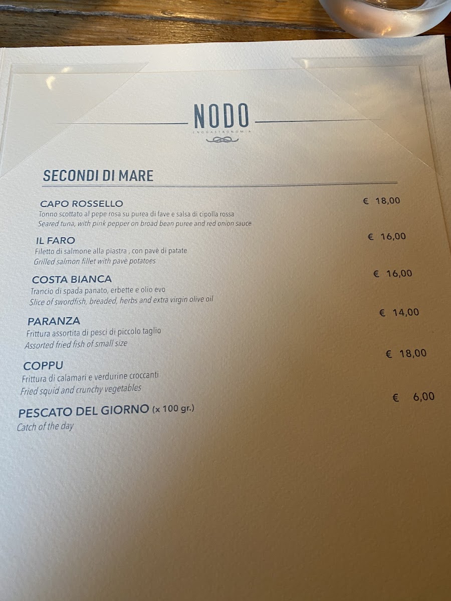 The menu at Nodo Bistrot presents a confident and well-curated expression of Sicilian-inspired cuisine, balancing land and sea with clarity and personality. Starters immediately set the tone, from the generous Antipasti Del Nodo to the freshness-driven Crudita Di Mare and Antipasto Di Mare, which highlight the restaurant’s strong connection to seafood. Fried selections such as Calamaretti Fritti, Cappuccetti Fritti, and Frittura Mista deliver crisp textures without feeling heavy, while traditional dishes like Zuppa Di Cozze and Inpepata Di Cozze emphasize depth of flavor and respect for classic preparation. The menu continues confidently with composed plates such as Calamaro Ripieno, Freddo Di Mare, and Arancino Di Pesce, each reinforcing the kitchen’s focus on quality ingredients and clean execution. For mains, options like Gnocchi with Shrimp, Pajella Valenziana, and Destructured Cannelloni provide variety and comfort, while Skirt Steak Almost Done adds a satisfying alternative for meat lovers. Lighter choices, including Salad, ensure balance across the menu. Desserts conclude the experience with elegance rather than excess: Cannolo Scomposto and Crema Catalana reinterpret familiar favorites, while Cheese Cake and Pistachio Cheesecake offer rich, refined sweetness. Overall, the menu feels cohesive and intentional, showcasing a thoughtful range of dishes that reflect both tradition and creativity without unnecessary complexity.